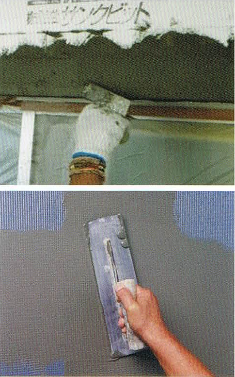 | 02 | 最下端部の軒天部、開口部回りなどに樹脂モルタルを塗り、補強用のメッシュの端部をはり付けます。(バックラップ用巻き返しメッシュの取り付け) | ![]() |